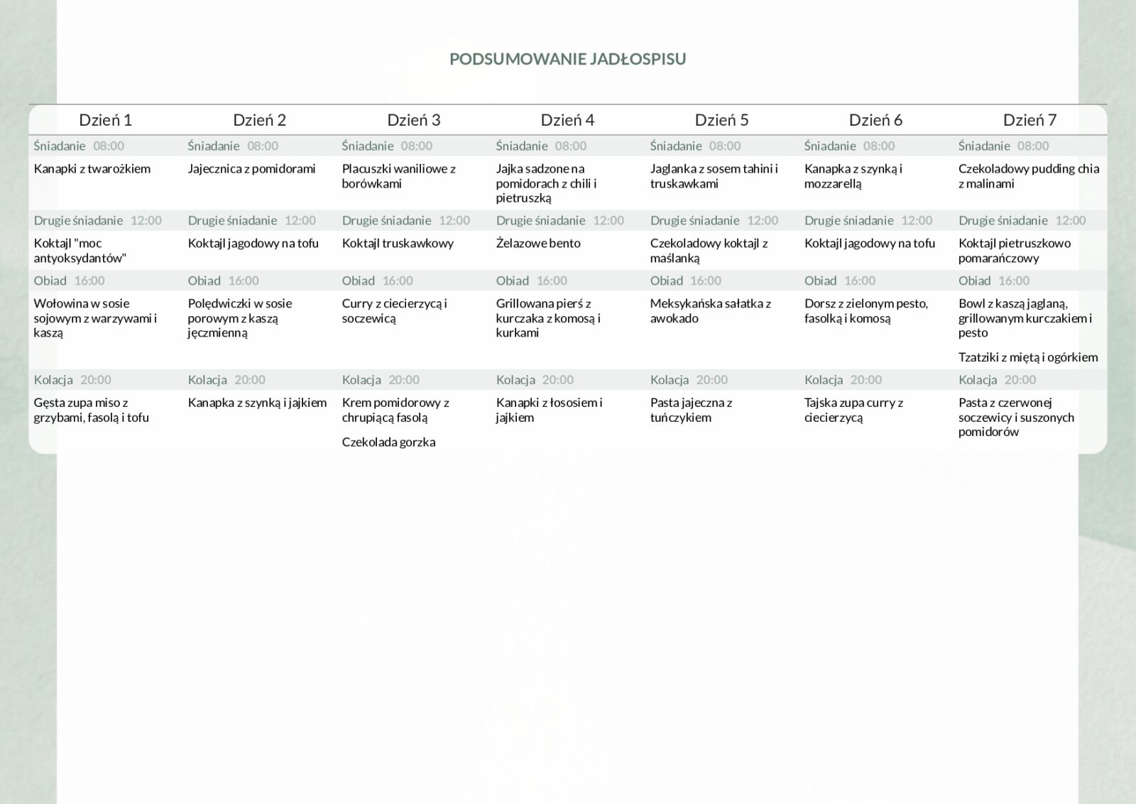 - Rozpiska dań na 7 dni, całość na 14 ni